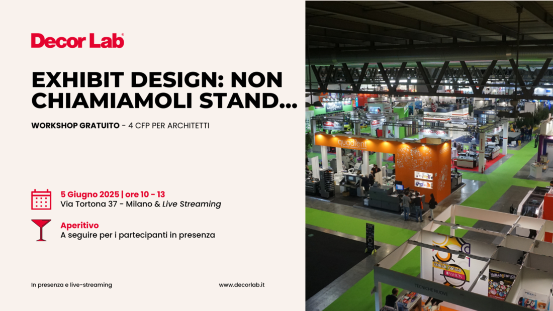 Se sei interessato ad approfondire questo tema e a scoprire le migliori soluzioni per il design espositivo, partecipa al workshop gratuito “Exhibit design: non chiamiamoli stand”, previsto per il 5 giugno presso Decor Lab (Milano) e in live streaming.