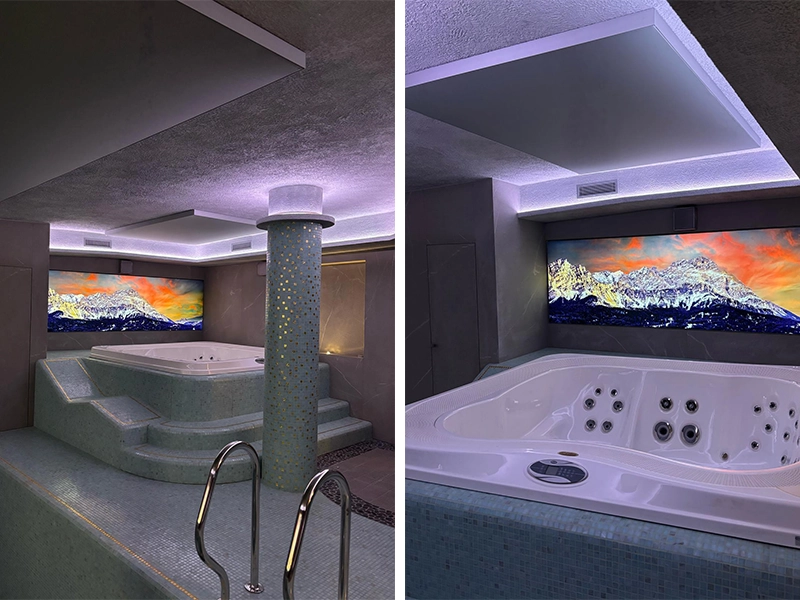 ABS Group ha realizzato due lightbox personalizzati e tre frame con fonoassorbenza di diverse dimensioni per migliorare il comfort ambientale di una spa privata. Il risultato è un’esperienza di benessere esclusiva, in cui la luce soffusa dei lightbox incontra l’eleganza del silenzio e la quiete avvolgente di un paesaggio montano.