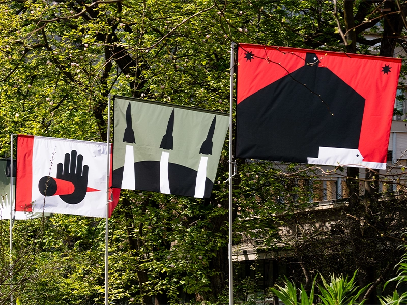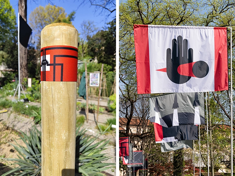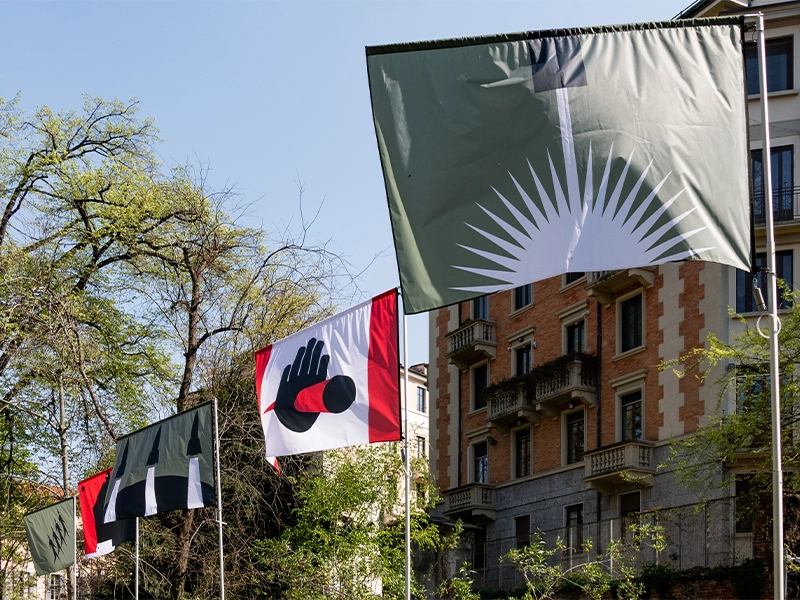 Nell’ambito di INTERNI Cre-Action, la grande mostra-evento ideata e organizzata dalla rivista INTERNI in occasione del FuoriSalone 2025, ABS Group ha realizzato diverse installazioni in allumino e tessuto. “War Flags” è un’installazione di grande effetto, che oscilla tra realtà e distopia, attraverso la quale Philippe Starck (con Babinet & Co) denuncia radicalmente le forze e le violenze in atto nel nuovo ordine mondiale emergente, esortando il pubblico a sviluppare una consapevolezza collettiva, a prendere posizione e ad agire. Per questo progetto, ABS Group ha realizzato due serie di dieci bandiere, the Night Flags e the Hate Flags, che riproducono i simboli della “Hate Unlimited Korporation”, un’azienda fittizia dedicata alla promozione dell’odio globale. Le bandiere, di circa 1,5 x 2,5 m ciascuna, sono state stampate in sublimazione su tessuto Spinnaker e installate presso l’Orto Botanico di Brera. I simboli rappresentati sulle Hate Flags sono stati riprodotti anche su 10 braccialetti in tessuto di 10 x 30 cm, applicati su altrettanti pali disposti lungo i viali dell’Orto.